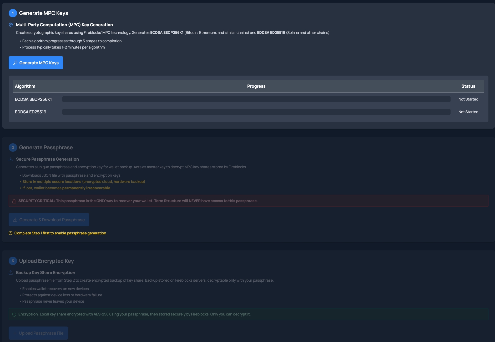 This section explains the key security concepts and procedures related to passphrases and MPC keys within TSI. Understanding these concepts is crucial for securely managing your digital assets on the platform.