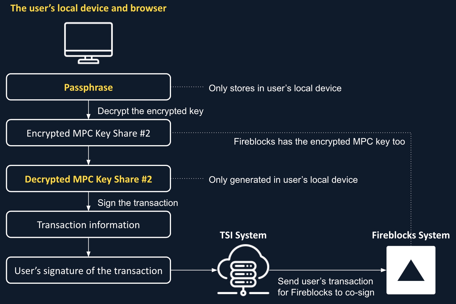 TSI utilizes Fireblocks' 2-of-2 Multi-Party Computation (MPC) scheme to enhance the security of digital signatures. This means that two key shares are required to sign any transaction: